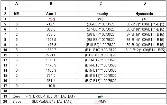 The INTERCEPT and SLOPE formulae in cells B19 and B20 utilise linear regression analysis. Column A provides the fixed x-axis component and column B the variable y-axis component. The INTERCEPT function returns the value in millivolts where the regression line intercepts the y-axis. The SLOPE returns the gradient of the regression line in millivolts per millimetre.